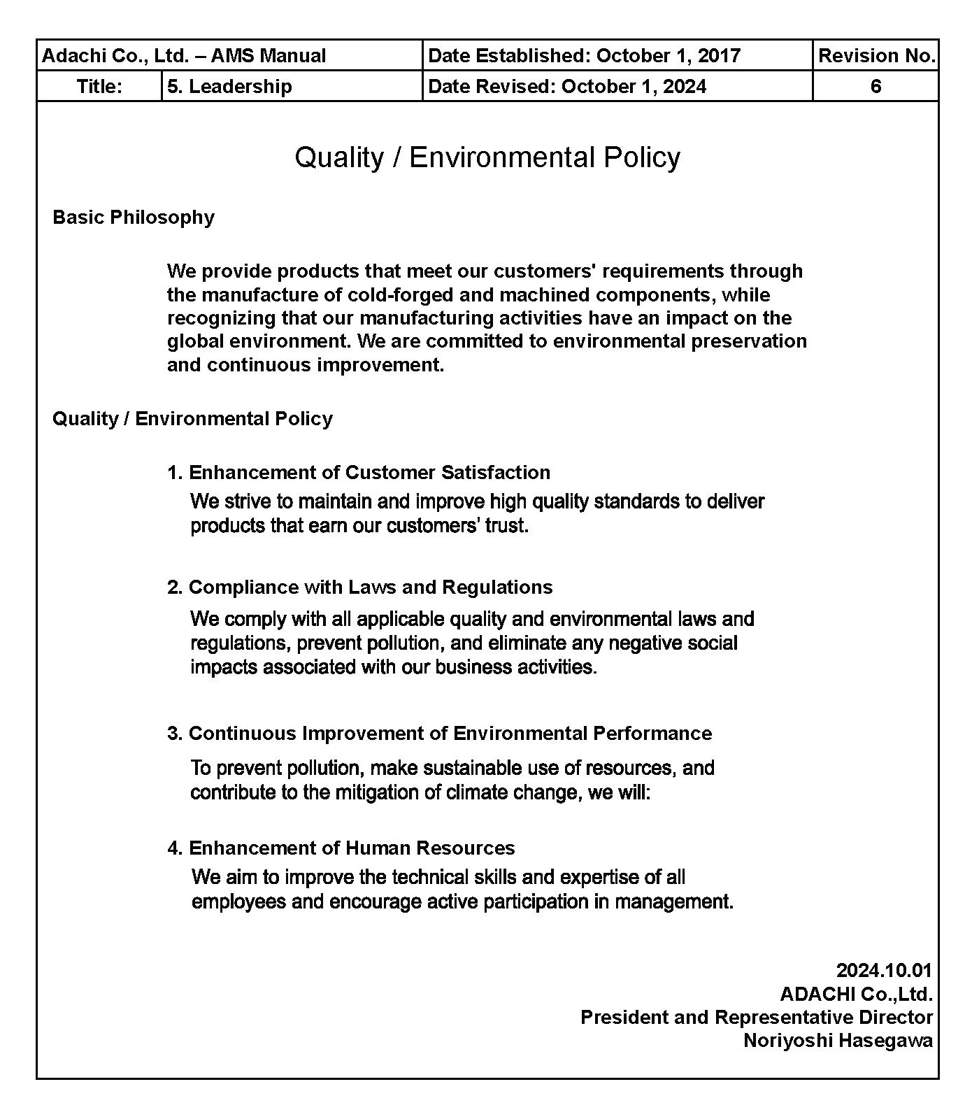 Additionally, we have obtained ISO 14001 certification for environmental management and are committed to conducting our business with careful consideration for the environment.